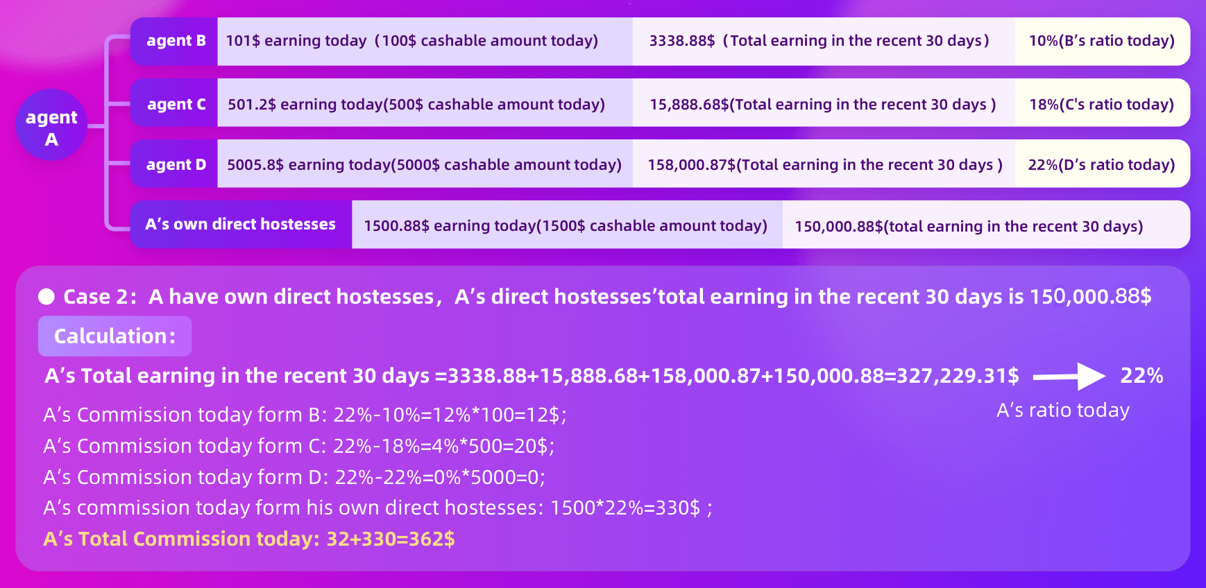 Ganhe com suas anfitriãs diretas + comissões de sobreposição dos subagentes que você convidar.